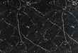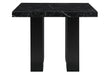 Black Faux marble counter table design with an extra thick top and a double pedestal base with silver connectors.