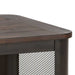 - Styling details include wire-brushed, plank-effect top, wire mesh ends and black metal accents.